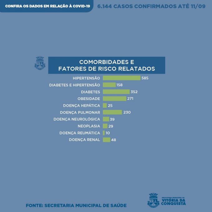 Os pacientes relataram uma ou mais comorbidades – quando há duas ou mais doenças preexistentes – ou fatores de risco para a Covid-19: Hipertensão (585), Diabetes e Hipertensão (158), Diabetes (352), Obesidade (271), Doença Hepática (25), Doença Pulmonar (230), Doença Neurológica (39), Neoplasia (29), Doença Reumática (10) e Doença Renal (48).