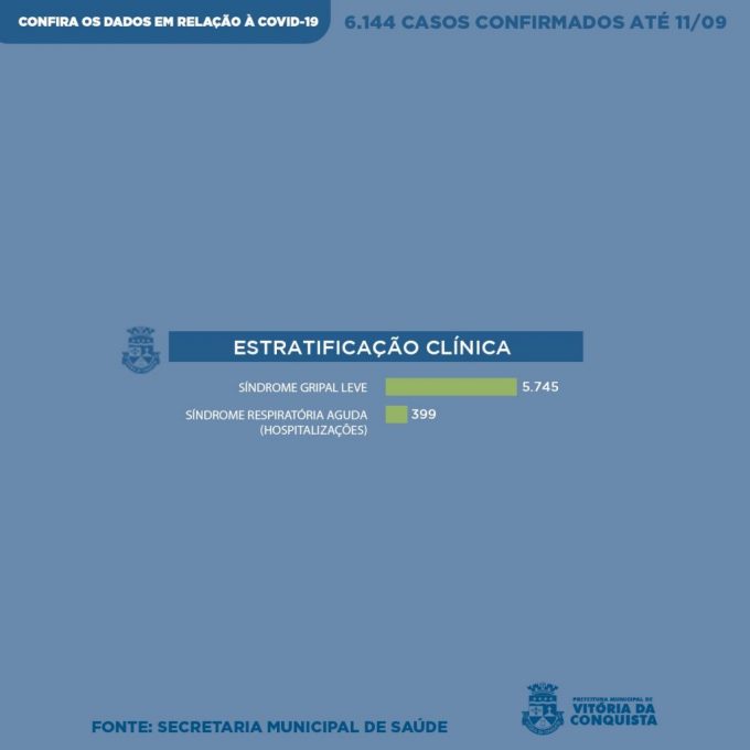 Nos últimos sete dias, 413 pessoas tiveram diagnóstico positivo para Covid-19, chegando a 6.144 casos confirmados em Conquista. O perfil epidemiológico atualizado desses pacientes foi divulgado neste sábado (12) pela Vigilância Epidemiológica, incluindo os novos casos, bem como os óbitos registrados nesta semana.
