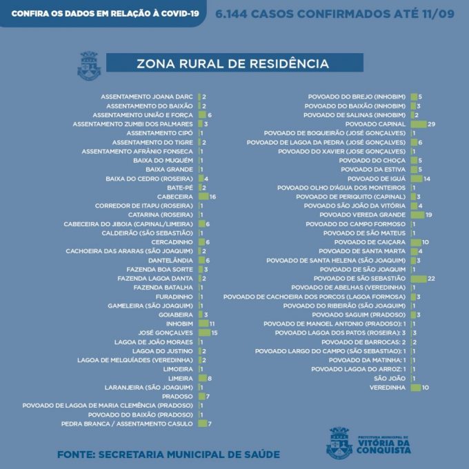 Enquanto que na zona rural foram confirmados 300 casos de residentes das seguintes localidades: Assentamento Joana Darc (2), Assentamento União e Força (6), Assentamento Zumbi dos Palmares (3), Assentamento Cipó (1), Assentamento Tigre (2), Assentamento Baixão (2), Assentamento Afrânio Fonseca (1), Baixa do Muquem (1), Baixa Grande (1), Baixa do Cedro – Roseira/José Gonçalves (4), Bate pé (2), Cabeceira (16), Corredor de Itaipu – Roseira (1), Catarina – Roseira (1), Cabeceira da Jiboia – Capinal/Limeira (6), Caldeirão – São Sebastião (1), Cercadinho (6), Cachoeira das Araras – São Joaquim (2), Dantelândia (6), Fazenda Boa sorte (3), Fazenda Lagoa Danta (2), Fazenda Batalha (1), Furadinho (1), Gameleira – São Joaquim (1), Goiabeira (3), Inhobim (11), José Gonçalves (15), Lagoa de João Moraes (1), Lagoa do Justino (2), Lagoa de Melquiades – Veredinha (2), Limoeira (1), Limeira (8), Laranjeira – São Joaquim (1), Pradoso (7), Povoado de Lagoa de Maria Clemência -Pradoso (1), Povoado do Baixão – Pradoso (1), Pedra Branca/Assentamento Casulo (7), Povoado do Brejo – Inhobim (5), Povoado do Baixão – Inhobim (3), Povoado Salinas – Inhobim (2), Povoado Capinal (29), Povoado de Boqueirão – José Gonçalves (1), Povoado Lagoa da Pedra – José Gonçalves (6), Povoado do Xavier – José Gonçalves (1), Povoado do Choça (5), Povoado da Estiva (5), Povoado de Iguá (14), Povoado Olho d’agua dos Monteiros (1), Povoado de Periquito – Capinal (3), Povoado São João da Vitória (4), Povoado Vereda Grande (19), Povoado Campo Formoso (1), Povoado São Mateus (1), Povoado Caiçara (10), Povoado de Santa Marta (4), Povoado de Santa Helena – São Joaquim (3), Povoado de São Joaquim (1), Povoado de São Sebastião (22), Povoado de Abelhas – Veredinha (1), Povoado de Cachoeira dos Porcos – Lagoa Formosa (3), Povoado de Ribeirão – São Joaquim (1), Povoado Saguim – Pradoso (3), Povoado de Manoel Antônio – Pradoso (1), Povoado Lagoa dos Patos – Roseira (3), Povoado de Barrocas (2), Povoado Largo do Campo – São Sebastião (1), Povoado da Matinha (1), Povoado Lagoa do Arroz (1), São João (1) e Veredinha (10).