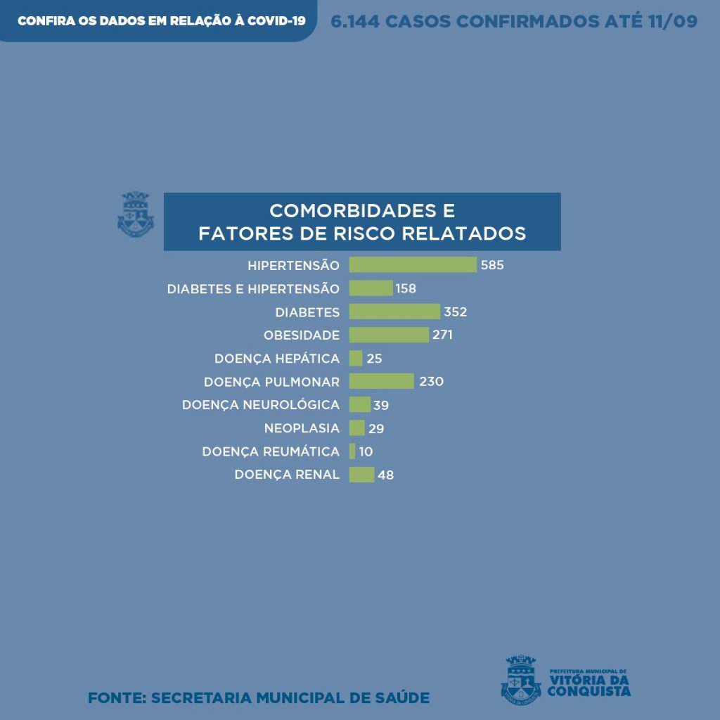 Os pacientes relataram uma ou mais comorbidades – quando há duas ou mais doenças preexistentes – ou fatores de risco para a Covid-19: Hipertensão (585), Diabetes e Hipertensão (158), Diabetes (352), Obesidade (271), Doença Hepática (25), Doença Pulmonar (230), Doença Neurológica (39), Neoplasia (29), Doença Reumática (10) e Doença Renal (48).
