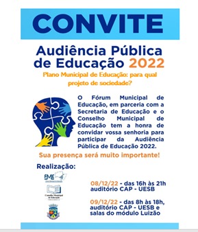 O Fórum Municipal de Educação (FME), Secretaria Municipal de Educação (Smed) e o Conselho Municipal de Educação (CME) promoverão, nos dias 8 e 9 de dezembro, na Uesb, uma audiência pública com o tema “Plano Municipal de Educação: para qual projeto de sociedade?”. A