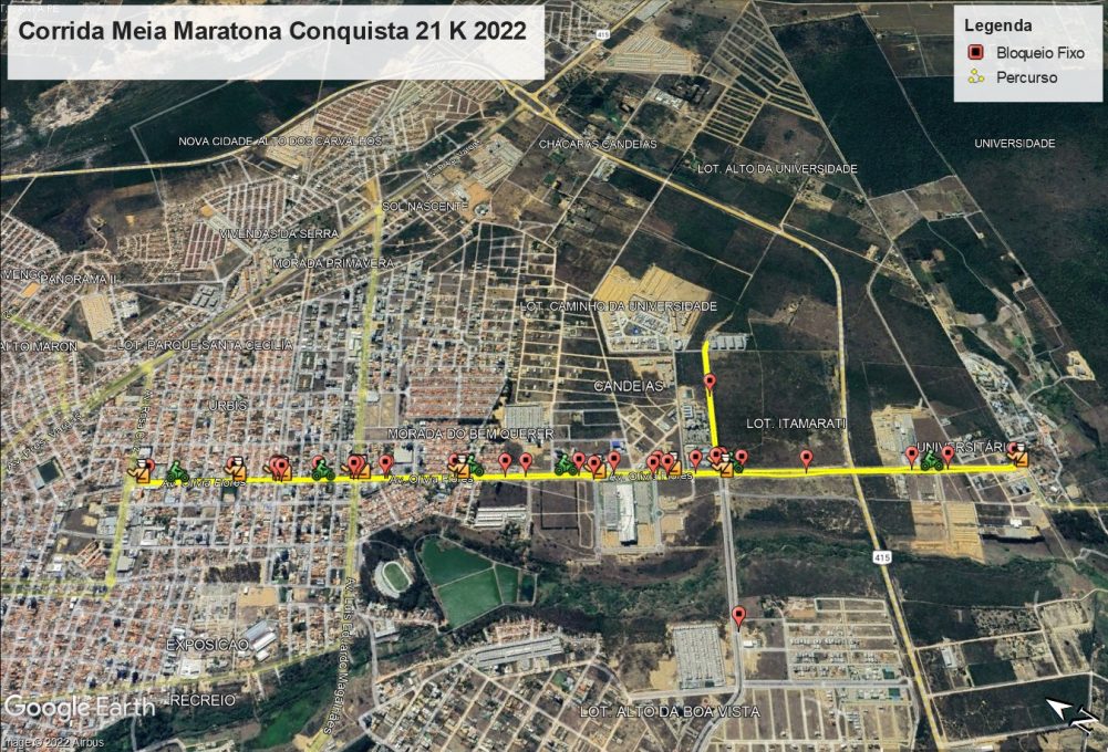 Das 5h às 12h do próximo domingo (4), as duas vias da Avenida Olívia Flores, tanto no sentido Centro – Uesb quanto no sentido Uesb – Centro, estarão parcialmente interditadas por conta da realização da Meia Maratona Conquista 21K, promovida pela Rádio Clube de Conquista. Os veículos que precisarem transitar pelas duas faixas deverão passar apenas pelo lado direito de cada uma e não poderão fazer nenhuma das conversões à esquerda, em ambos os sentidos.