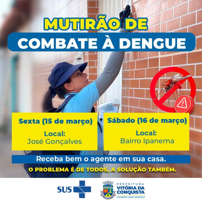 Os agentes de combate às endemias estarão mobilizados, nesta sexta (15) e sábado (16), em mutirões de combate à dengue na zona urbana e rural de Vitória da Conquista, com o apoio dos agentes comunitários de saúde e dos militares do Exército Brasileiro.