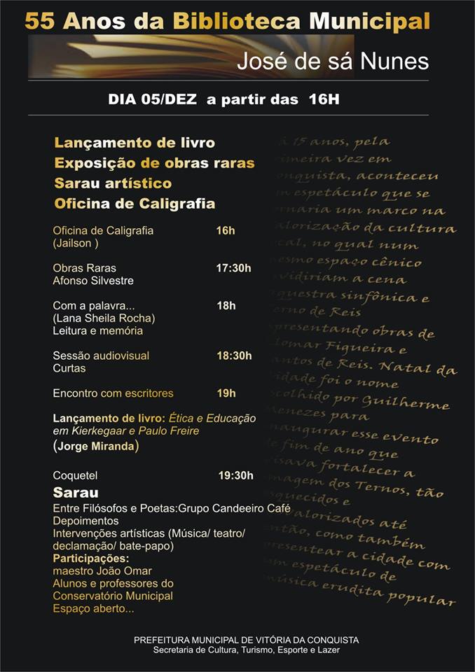 Nessa quinta-feira, 5, a Biblioteca Municipal José de Sá Nunes completa 55 anos. E para comemorar essa data tão especial, será realizado um ato comemorativo a partir das 16h, no local. A programação inclui exposição de obras raras, lançamento de livro, oficinas e um sarau artísticos.