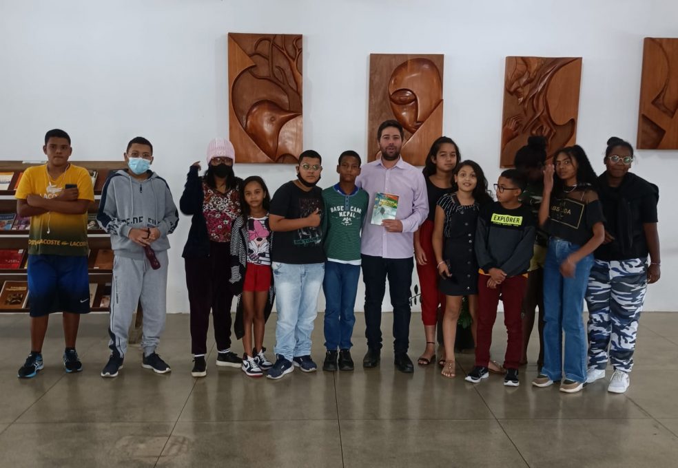 Crianças atendidas pelo CRAS Nossa Senhora Aparecida e Diêgo Gomes, que lançou seu primeiro livro “Herzem Gusmão, a voz de Conquista”
