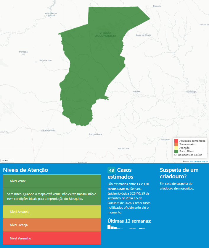 Com a queda no número de notificações, o município saiu do nível vermelho (epidemia) do sistema do Ministério da Saúde (Info Dengue da FIOCRUZ) para o nível verde, ou seja, no momento, não há epidemia de arboviroses em Conquista, não existe transmissão e nem condições ideais para a reprodução do mosquito.