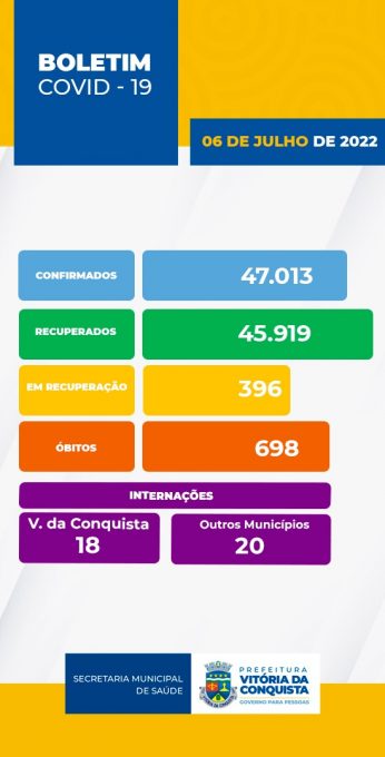 Vitória da Conquista contabilizou 182 novos casos de Covid-19 nesta quarta-feira (6). De acordo com o boletim epidemiológico da Secretaria Municipal de Saúde (SMS), não houve registro de óbito e o total permanece em 698.