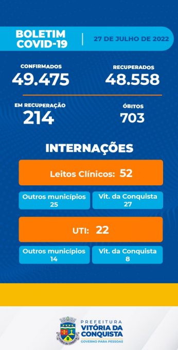 De acordo com o boletim epidemiológico da Secretaria Municipal de Saúde (SMS), Vitória da Conquista confirmou 54 novos casos de Covid-19 nesta quarta-feira (27), totalizando 49.475 desde o início da pandemia.