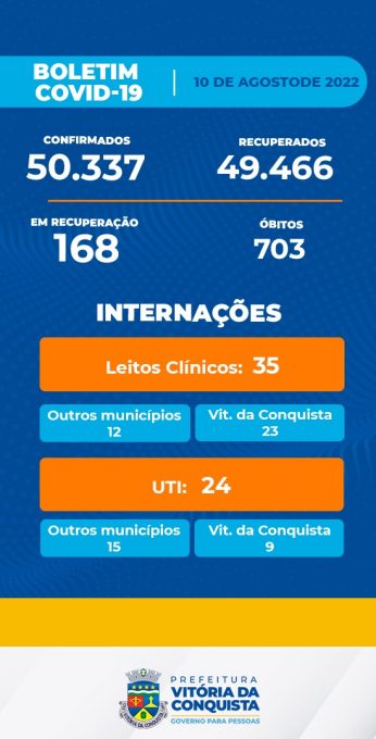 A Secretaria Municipal de Saúde (SMS) divulgou o Boletim Epidemiológico desta quarta-feira (10), que informa que Vitória da Conquista registrou 58 novos casos de Covid-19. Não houve registro de morte de morador do município pela doença.