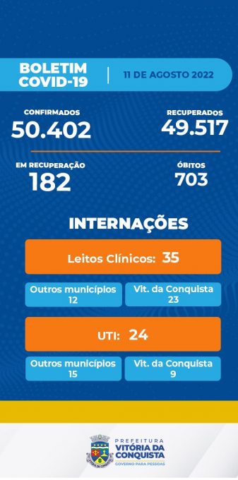 Neste momento, há 59 pacientes internados na rede SUS e hospitais particulares da cidade, dos quais 32 são moradores de Vitória da Conquista e 27 de outros municípios.