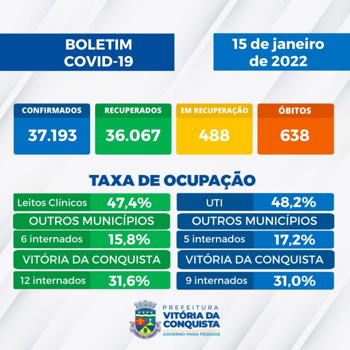 Ocupação dos leitos – 32 pacientes estão internados em parte dos 67 leitos, sendo 38 de enfermarias e 29 de unidade de terapia intensiva. Os internados são moradores de Vitória da Conquista e dos seguintes municípios: Anagé, Barra da Estiva, Barra do Choça, Caatiba, Érico Cardoso, Iguaí, Itambé, Itapetinga, Maiquinique, Riacho de Santana e Tremedal.