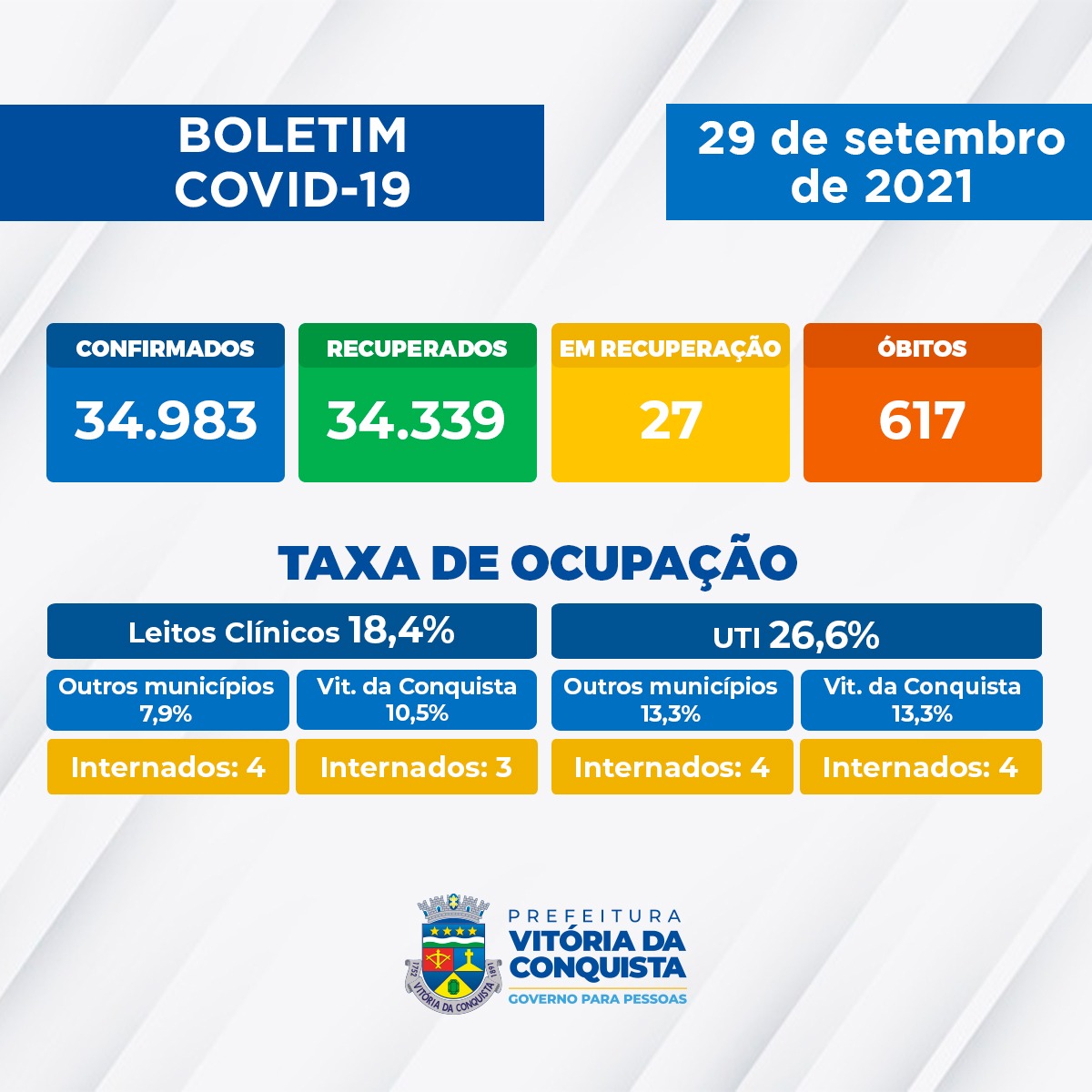 O boletim da Secretaria Municipal de Saúde (SMS), atualizado às 17 horas desta quarta-feira (29), não registra óbito de morador de Vitória da Conquista por Covid-19. Este é o 11º dia consecutivo sem mortes por complicações da doença. O total de óbitos permanece em 617.