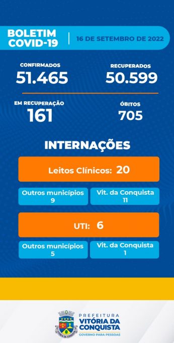 Ocupação de leitos – Neste momento, 26 pacientes estão internados nos hospitais públicos e particulares de Vitória da Conquista, sendo 12 moradores do município e 14 de outras localidades.