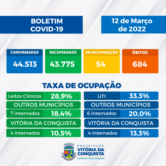 Em Vitória da Conquista, mais dois casos de Covid-19 foram confirmados neste sábado (12). Ao todo são 44.513 casos, sendo 43.775 recuperados, 684 óbitos e 54 que estão em recuperação.