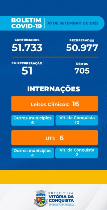 De acordo com o boletim epidemiológico divulgado nesta sexta-feira (30) pela Secretaria Municipal de Saúde (SMS), 40 novos casos de Covid-19 foram confirmados em Vitória da Conquista. Assim, o número total de casos, desde o início da pandemia, chega a 51.733. Desses, 50.977 já estão recuperados e 51 pessoas estão em recuperação. O total de óbitos permanece em 705.
