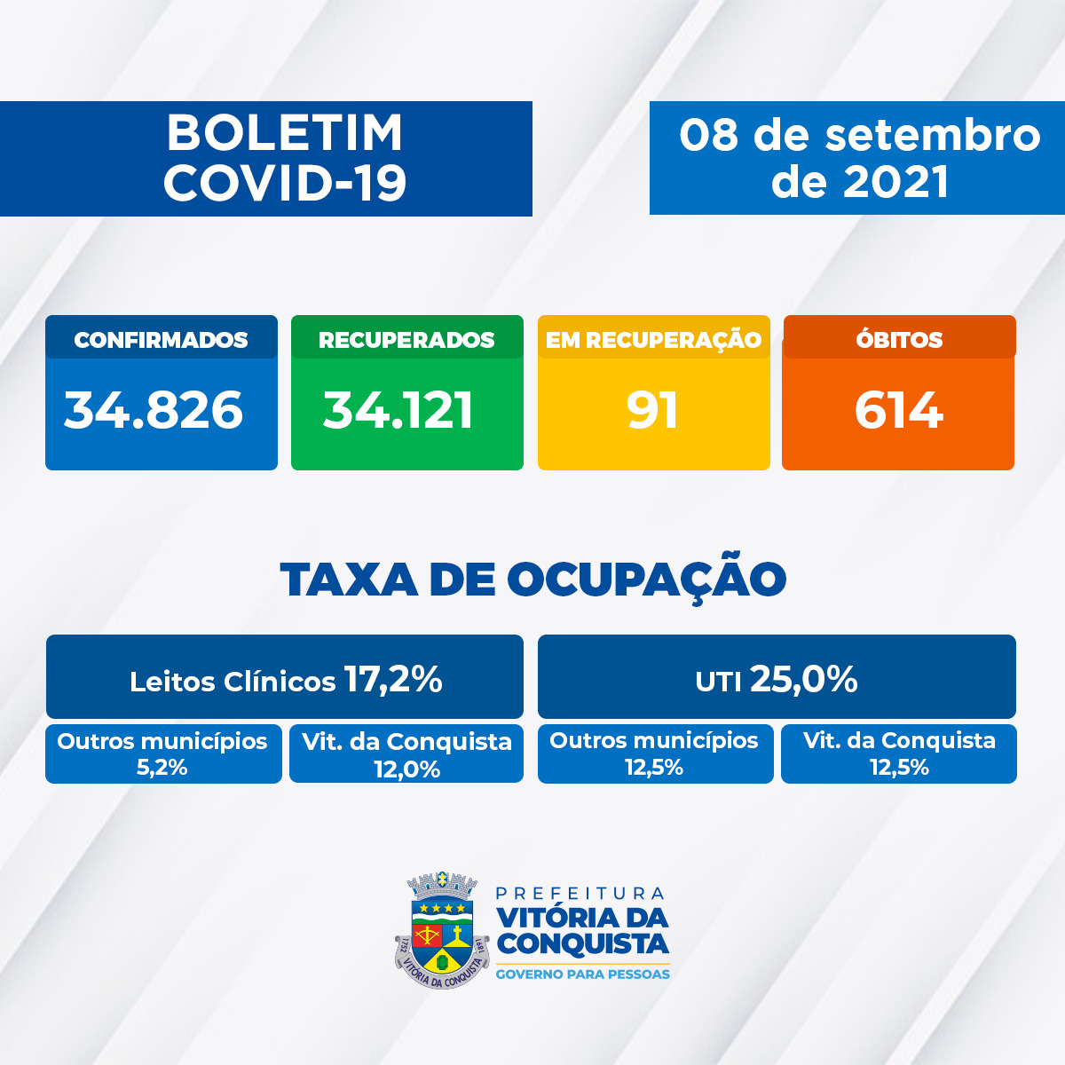 Nesta quarta-feira (8), a Secretaria Municipal de Saúde (SMS) confirmou 16 novos casos de Covid-19, totalizando 34.826 em Vitória da Conquista. Destes, 34.121 estão recuperados e 91 estão em recuperação, sendo que dez estão internados e 81 em tratamento domiciliar.