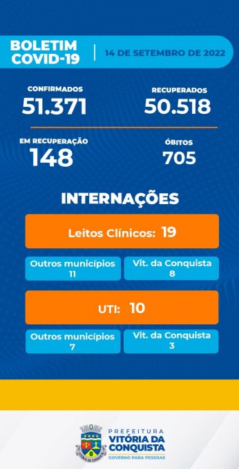 O Boletim Epidemiológico divulgado hoje (14) pela Secretaria Municipal de Saúde (SMS) informa o registro de 120 novos casos de Covid-19. Assim, o total de casos confirmados em Vitória da Conquista, desde o início da pandemia, chega a 51.371, dos quais 50.518 estão recuperados e 148 encontram-se em recuperação. O número de óbitos permanece em 705.