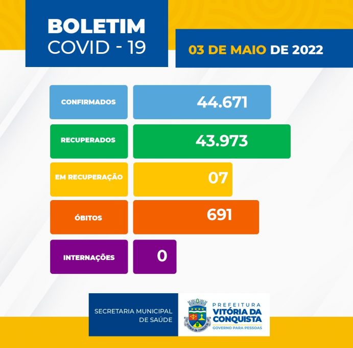 Segundo boletim divulgado pela Secretaria Municipal de Saúde (SMS), Vitória da Conquista não registrou novos casos de Covid-19 e nenhuma morte pela doença nesta terça-feira (3). Também segundo o boletim, sete pessoas estão se recuperando da doença.