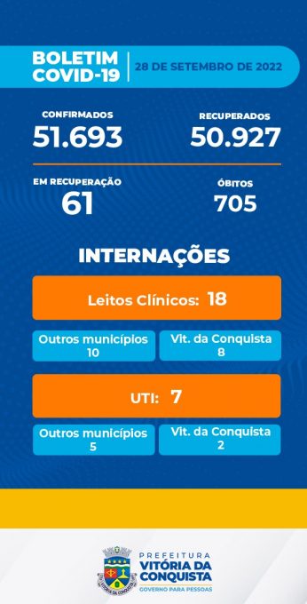Ocupação de leitos – Neste momento, 25 pacientes estão internados nos hospitais públicos e particulares de Vitória da Conquista, sendo 10 moradores do município e 15 de outras localidades.