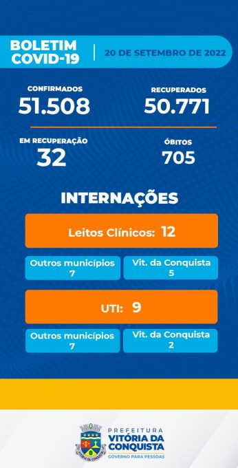 A Secretaria Municipal de Saúde (SMS) divulgou nesta terça-feira (20) mais um Boletim Epidemiológico, segundo o qual foram registrados três novos casos de Covid-19 nas últimas 24 horas. Portanto, Vitória da Conquista chegou a 51.508 casos confirmados desde o início da pandemia, dos quais 50.771 estão recuperados, 705 evoluíram para óbito e 32 encontram-se em recuperação.