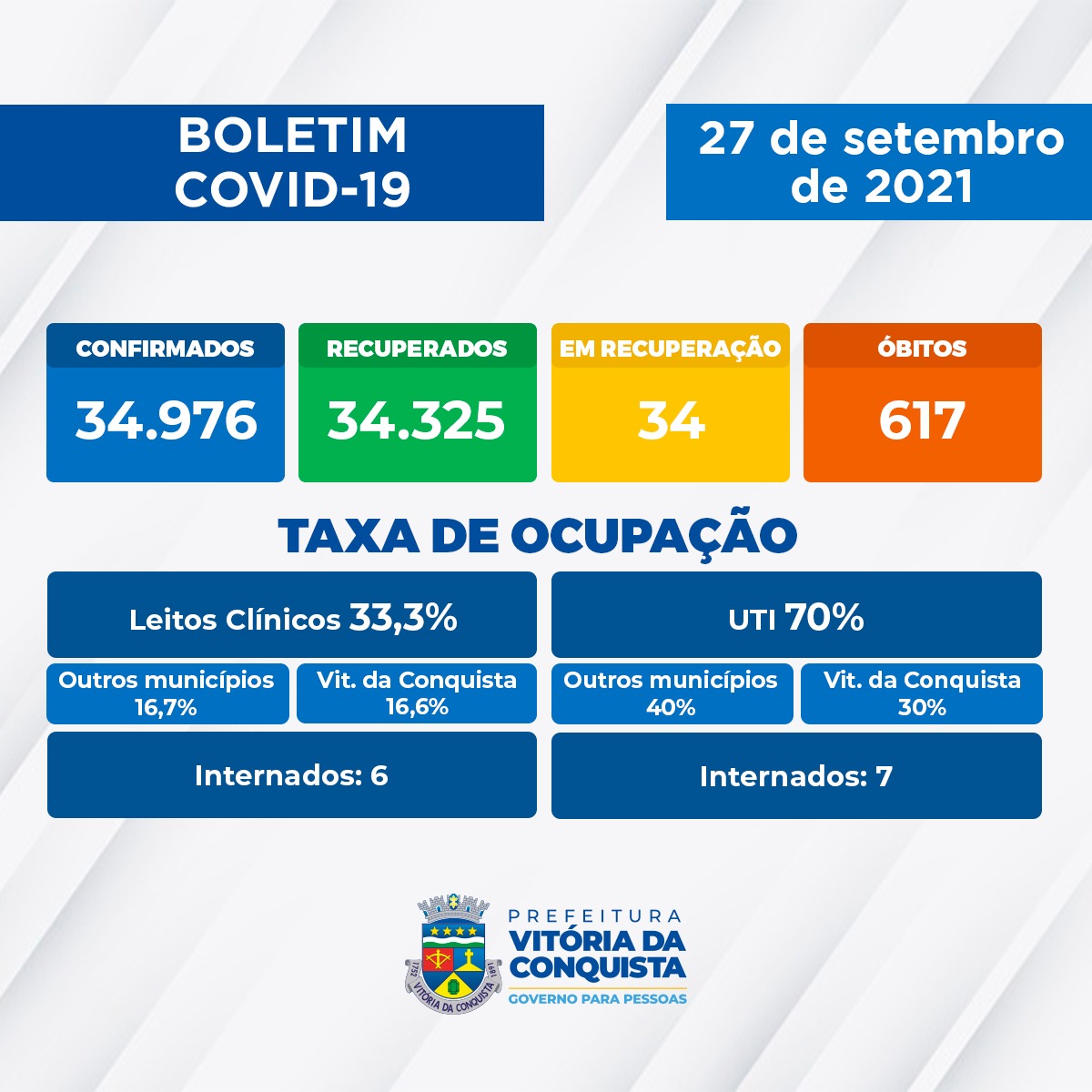 Segundo a Secretaria Municipal de Saúde (SMS) pelo nono dia seguido, não há registro de óbito de morador de Vitória da Conquista por Covid-19. O último ocorreu no dia 18. O total é de 617 óbitos.