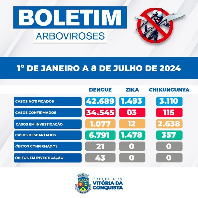 Neste ano, foram registradas 42.689 notificações suspeitas de dengue, com 34.545 casos confirmados. Também foram registrados, nesse período, 3.110 notificações para chikungunya, com 115 confirmados, além de 1.493 notificados de zika, com três confirmações.