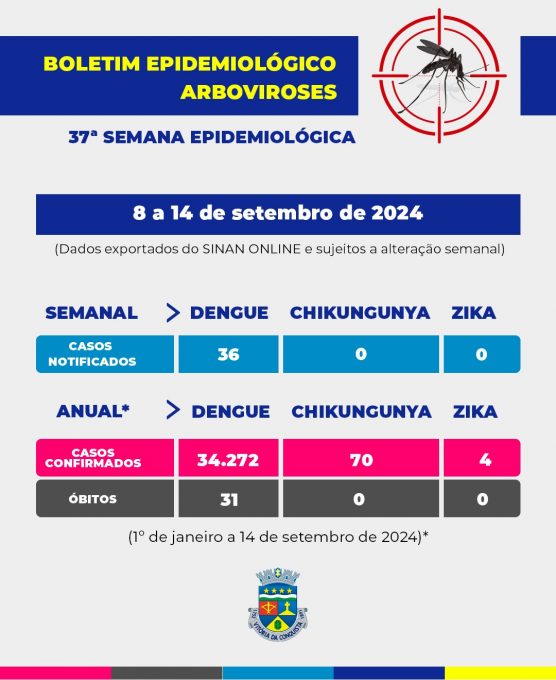 A Secretaria Municipal de Saúde (SMS) divulgou, nesta quinta-feira (19), o Boletim Epidemiológico referente à 37ª semana de 2024, abrangendo o período de 8 a 14 de setembro. Durante esses dias, foram notificados 36 casos suspeitos de dengue.