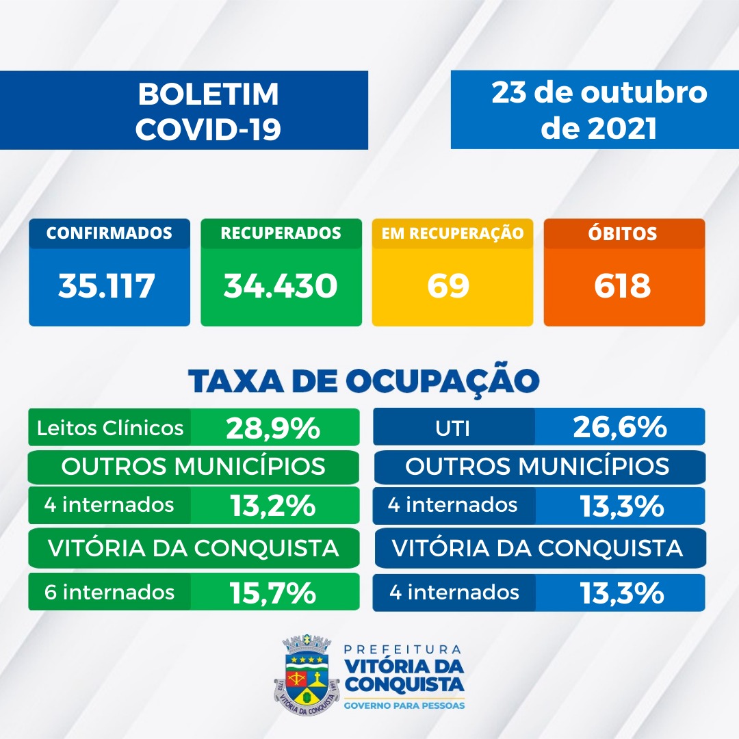 Até às 17 horas deste sábado (23), não houve registro de morte de morador de Vitória da Conquista causada pela Covid-19, de acordo com o boletim da Secretaria Municipal de Saúde (SMS). São 23 dias de outubro com apenas uma morte. No total, são 618 óbitos.