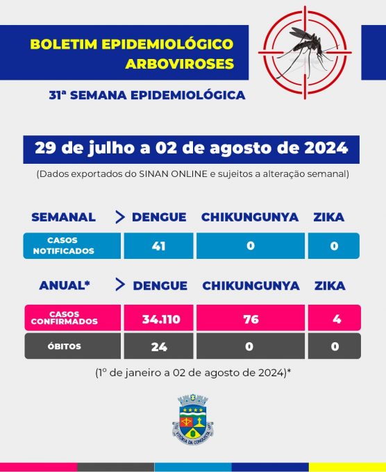 A Secretaria Municipal de Saúde (SMS) divulgou, nessa terça-feira (6), o boletim epidemiológico semanal das arboviroses da 31ª semana epidemiológica (29 de julho a 2 de agosto), que notificou 41 novos casos suspeitos de dengue, nenhum caso suspeito de chikungunya e zika, sem registro de óbitos desde o dia 8 de julho.
