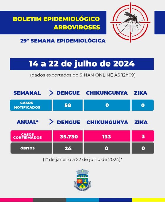 A Vigilância Epidemiológica (Viep) Municipal divulgou, nesta terça-feira (23), o boletim epidemiológico semanal das Arboviroses da 29ª semana epidemiológica (14 a 22 de julho), que notificou 58 novos casos suspeitos de dengue em Vitória da Conquista, sem registro de óbito suspeito da doença.