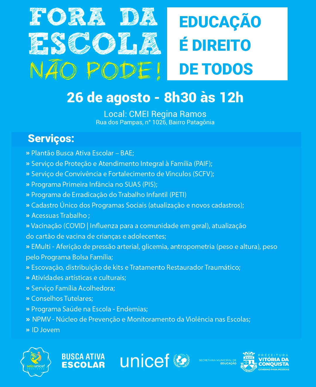 O Centro Municipal de Educação Infantil (Cmei) Regina Ramos Cairo, localizado na Rua dos Pampas, 1026, no bairro Patagônia, receberá no próximo sábado (26), a 5ª edição 2023 do Projeto “Fora da Escola Não Pode: educação é direito de todos”. A equipe da Busca Ativa Escolar estará atuando na identificação de crianças e adolescentes que estão fora da escola. Ao mesmo tempo, junto com os profissionais do Cmei, vários serviços estarão sendo oferecidos à comunidade. O evento começa às 8h30 e vai até 12h.