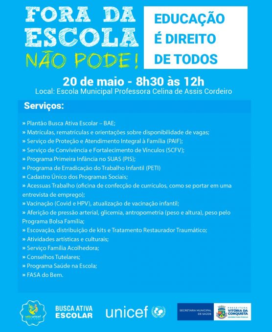 Vinculada ao Selo Unicef, a ação é intersetorial envolvendo as secretarias municipais de Educação (Smed), Saúde (SMS), Desenvolvimento Econômico (SMDE) e Desenvolvimento Social (Semdes). Várias atividades estarão acontecendo na unidade escolar, que também contará com a presença dos Conselhos Tutelares e parceiros da iniciativa privada.