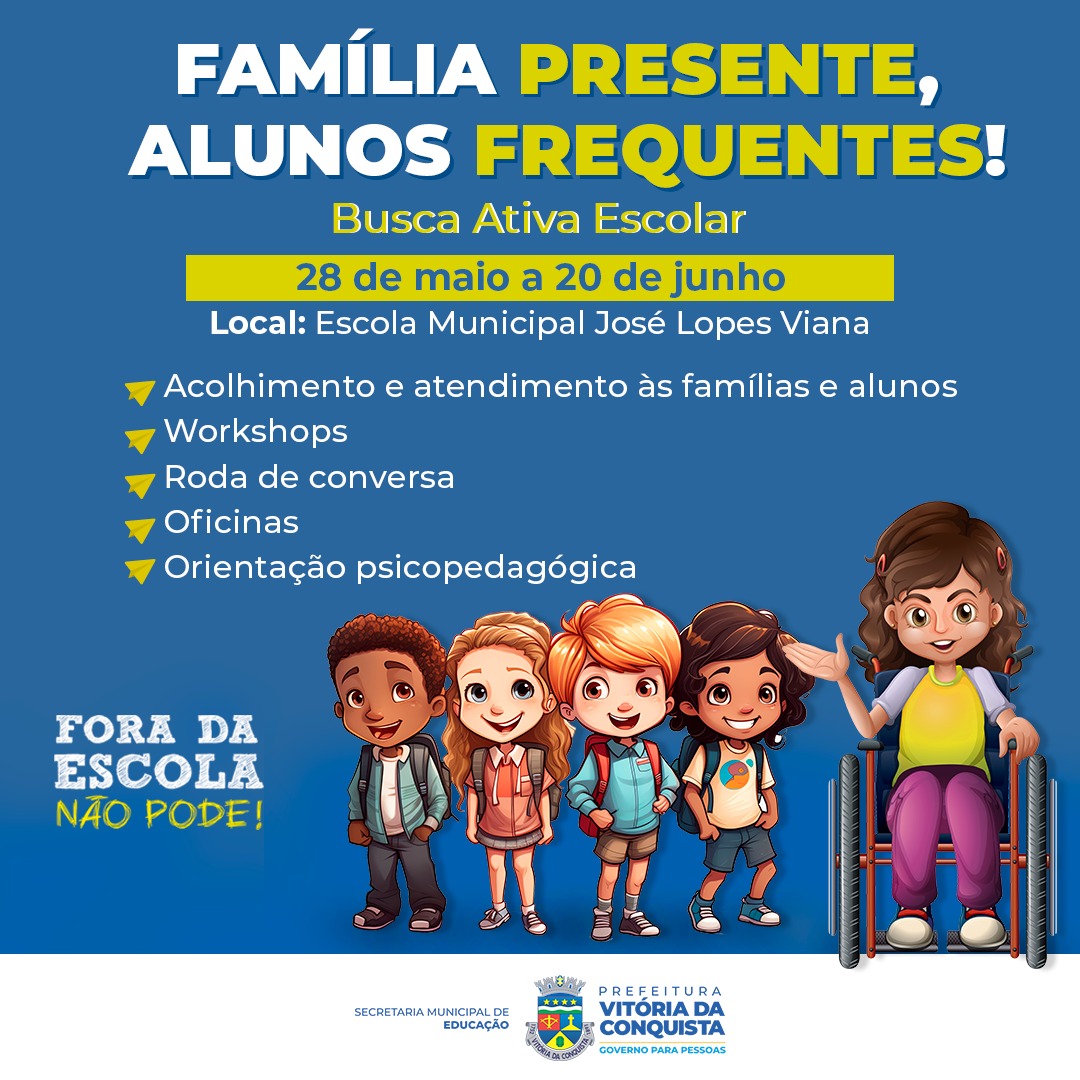 A Secretaria Municipal de Educação (Smed), por meio do Busca Ativa Escolar (BAE), está lançando o Projeto Família Presente, Alunos Frequentes, para aprimorar a busca pelo aluno que está em idade escolar, mas tornou-se infrequente na unidade. O Projeto-Piloto começou a ser aplicado no dia 28 de maio e segue até 20 de junho, na Escola Municipal José Lopes Viana, localizada no bairro Campinhos.