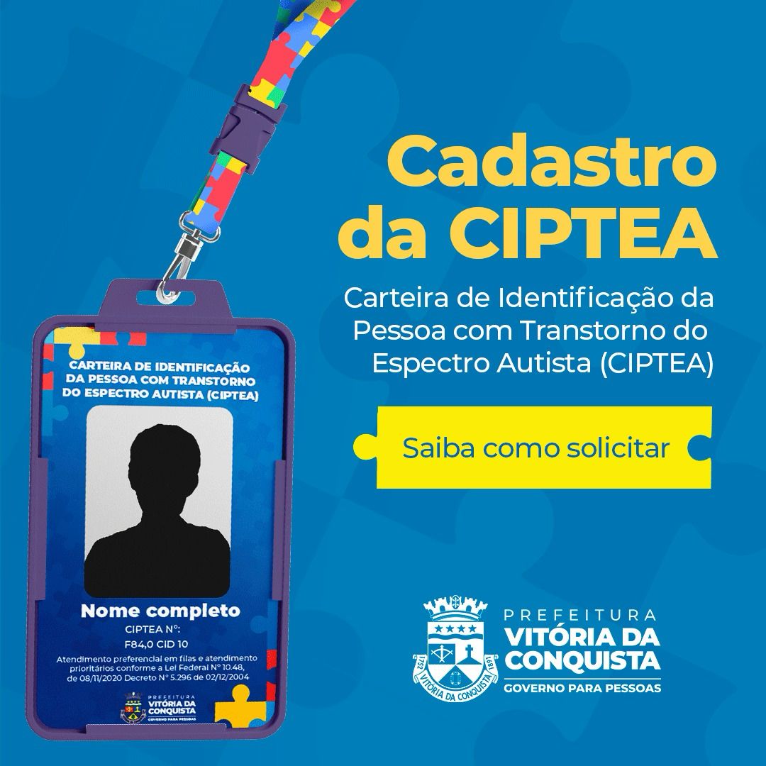 A partir do dia 21 de agosto, será ampliado o cadastramento para a confecção da Carteira de Identificação da Pessoa com Transtorno do Espectro Autista (CIPTEA), documento que certifica atenção integral, pronto atendimento e prioridade no acesso a serviços públicos e privados, especialmente nas áreas de saúde, educação e assistência social. Dessa vez, o público poderá comparecer espontaneamente no dia de sua preferência.
