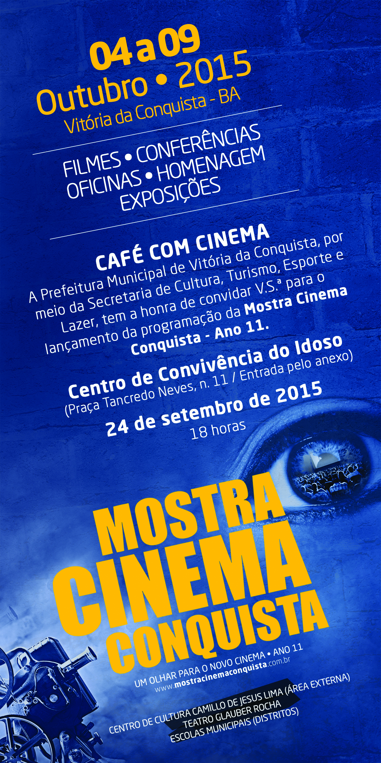A Mostra Cinema Conquista – Ano 11 conta com exibição de 47 filmes, além de conferências, oficinas e exposições que serão realizados durante sete dias na área externa do Centro de Cultura Camillo de Jesus Lima, no Teatro Glauber Rocha e em distritos do município. Nesta edição, o evento traz ainda homenagens ao cineasta e ator conquistense, Paulo Tiago Leite, falecido em novembro de 2014.