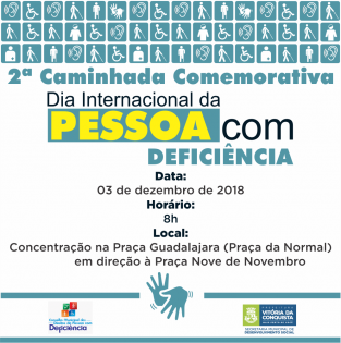 Acontece na próxima segunda (03), a 2ª Caminhada Comemorativa ao Dia Internacional da Pessoa com Deficiência. Com início previsto para às 8h, a concentração será na Praça Guadalajara (Praça da Normal), com destino à Praça 9 de Novembro. A promoção é do Conselho Municipal dos Direitos da Pessoa com Deficiência, junto às associações, com o apoio da Prefeitura Municipal de Vitória da Conquista.