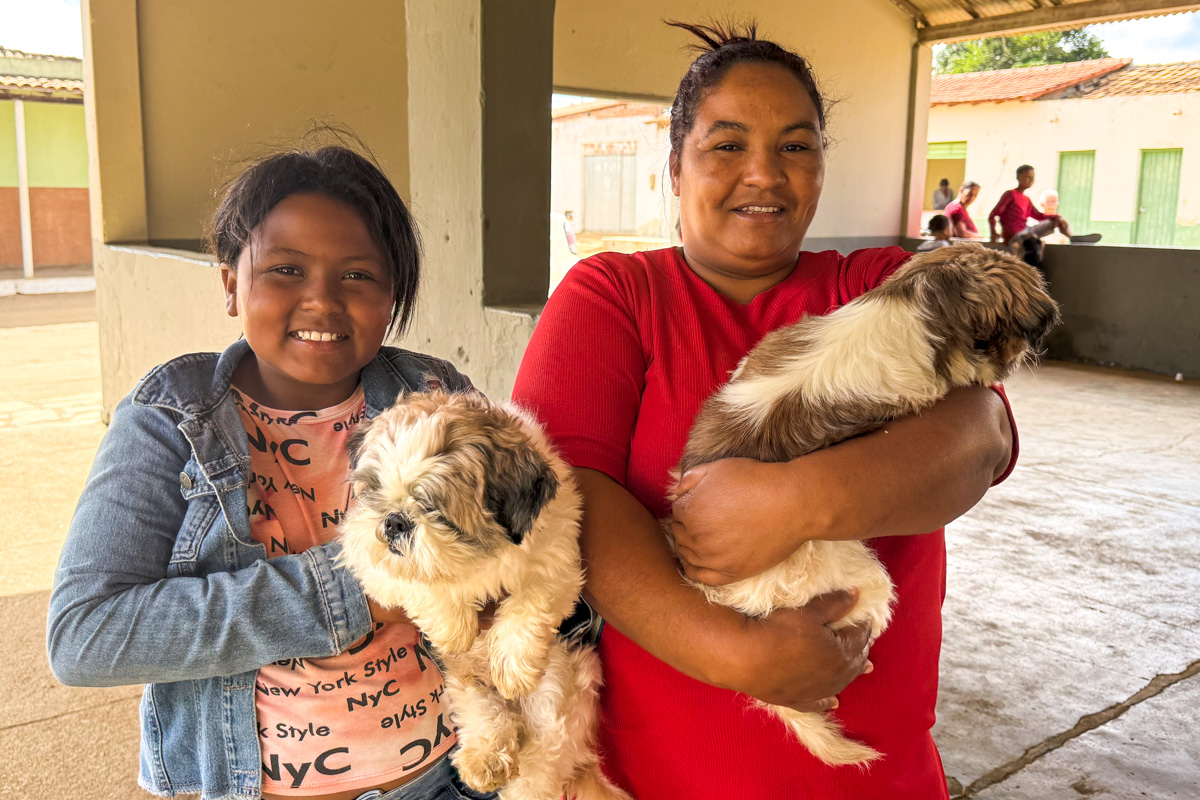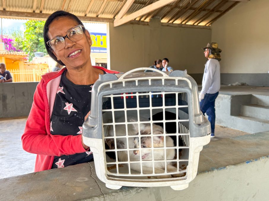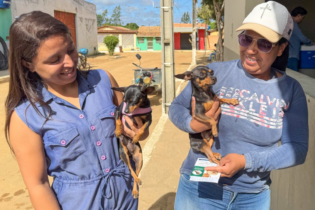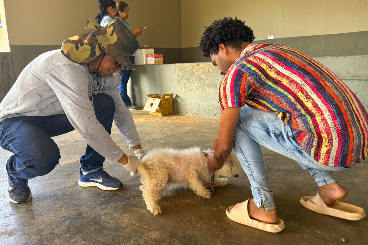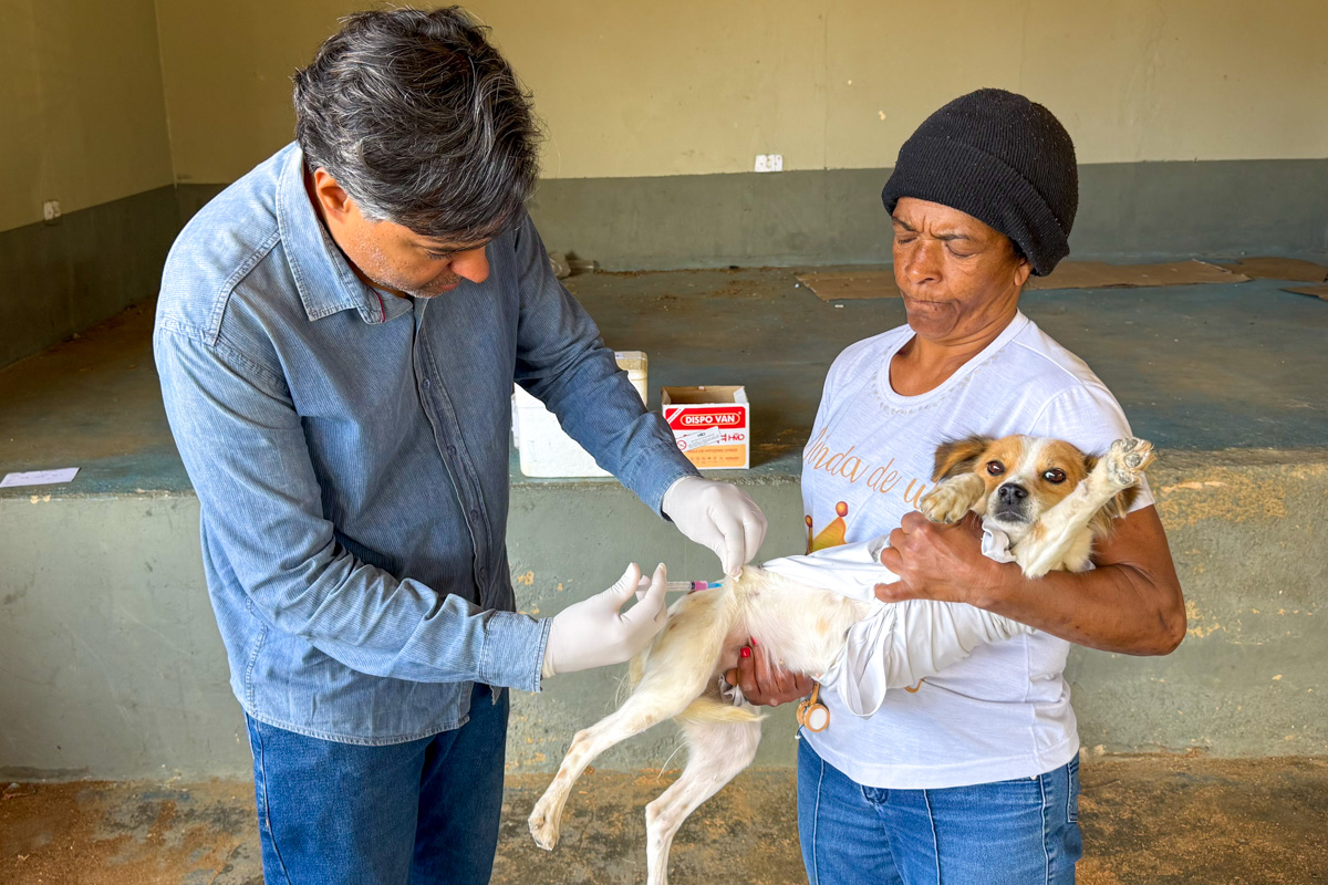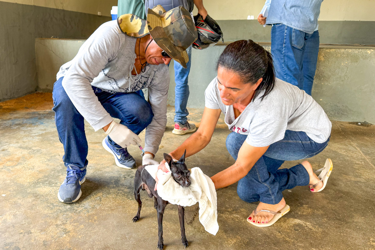 Nesta terça-feira (5), o distrito de Veredinha recebeu a visita da equipe de vacinadores. Marluci Nascimento Oliveira levou seus dois cachorros, Amora e Chico, para vacinar. “Essa vacina é muito importante, principalmente porque eles são bravos. Então, é uma proteção para eles e para nós”, explicou Marluci.