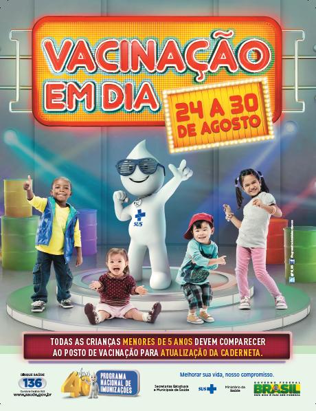 Atenção! Entre os dias 24 e 30 de agosto será realizada a campanha de multivacinação para todas as crianças menores de 5 anos. Elas deverão ser levadas a um posto de vacinação, pelos pais ou responsáveis, com a caderneta de saúde. Todas as vacinas do calendário básico de vacinação da criança estarão disponíveis para atualização.