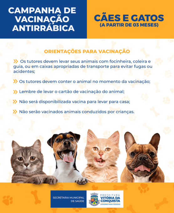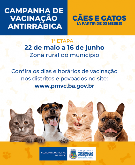 A Campanha de Vacinação Antirrábica será antecipada em Vitória da Conquista, com a primeira etapa começando pela zona rural. Serão contemplados 143 distritos e povoados, no período de 22 de maio a 16 de junho.