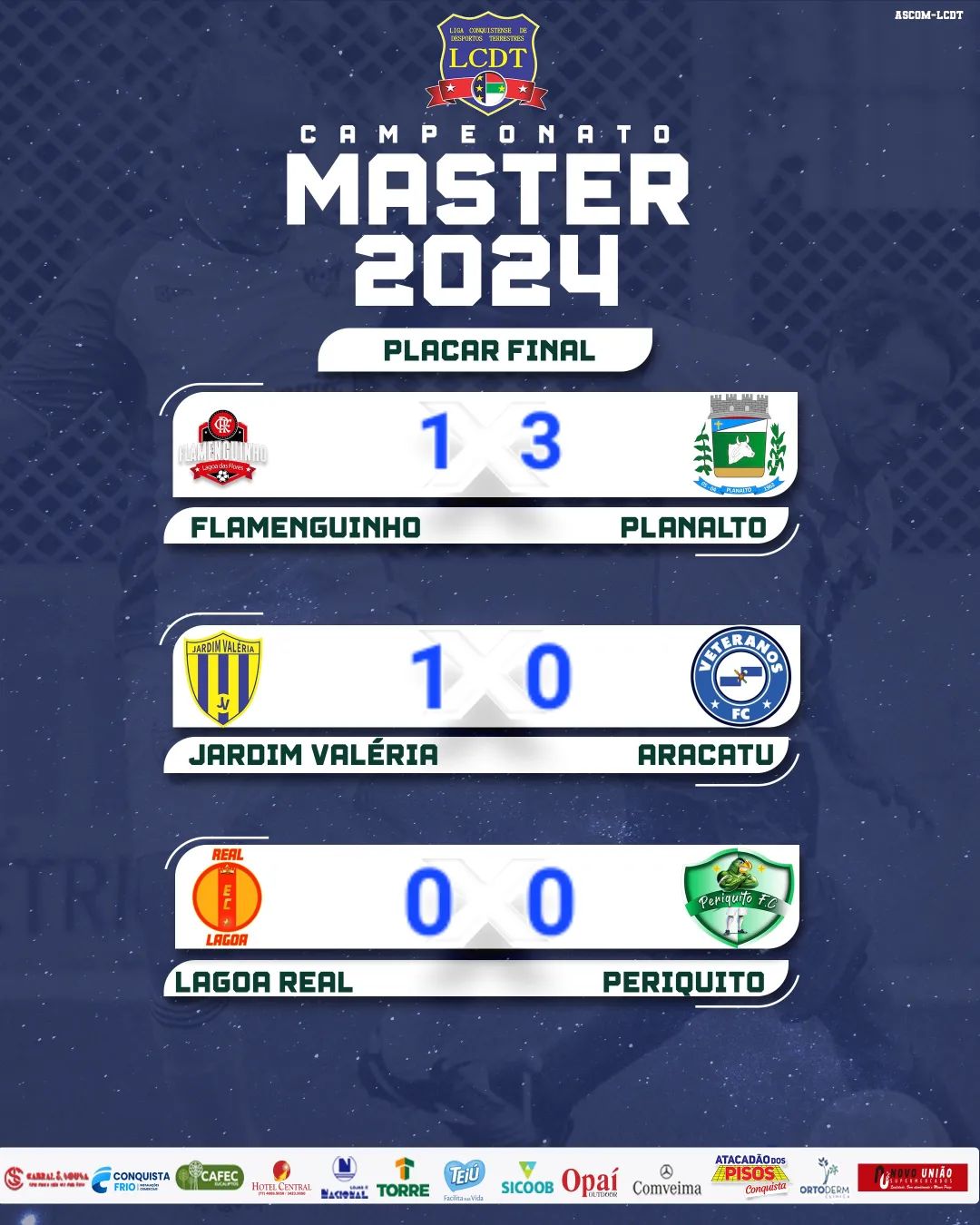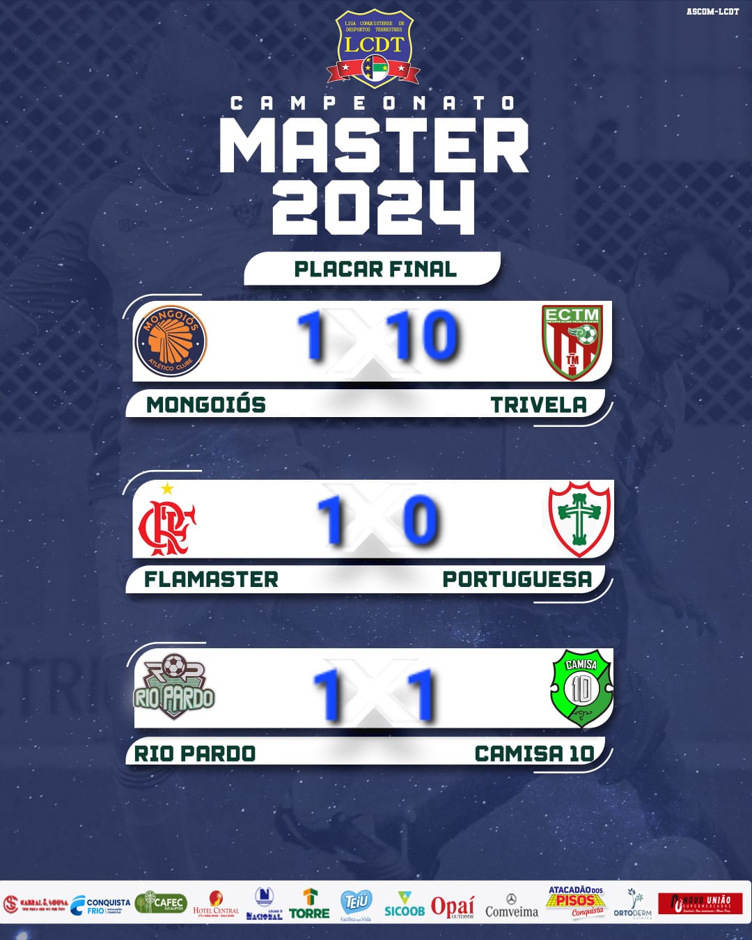 O Campeonato de Futebol Máster concluiu a quinta rodada neste final de semana, a penúltima antes das quartas de final. Neste sábado (16) e domingo (17), ocorrerá a rodada decisiva, a última da fase de grupos do torneio. A competição, organizada pela Liga Conquistense de Desportos Terrestres (LCDT), com o apoio do Governo Municipal, reúne 12 equipes de futebol amador máster, compostas por jogadores a partir dos 40 anos.