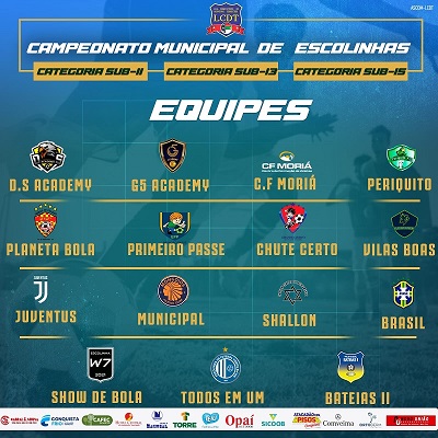 A categoria Sub-13/14 terá a participação de oito escolinhas: DS Academy, Periquito, Municipal, Show de Bola, Primeiro Passe, G5 Academy, Planeta Bola e Shallon.