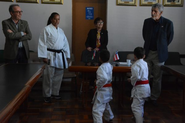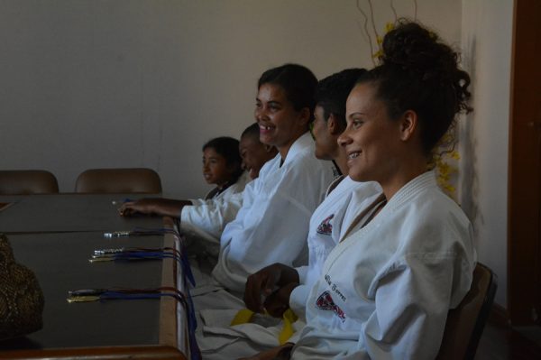 Os meninos e meninas da oficina de karatê foram exibir suas medalhas: 16 de ouro, quatro de prata e três de bronze nas categorias kata e kumitê. Na oportunidade, os dois alunos mais novos da turma fizeram uma pequena apresentação do Kata, orientados pela instrutora da oficina de karatê, Elaine Oliveira.