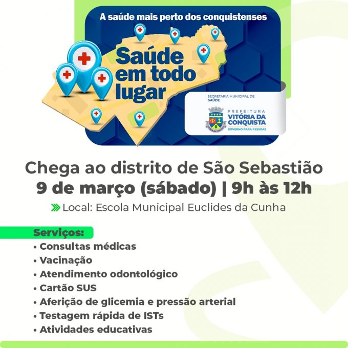 Mais uma edição do projeto Saúde em Todo Lugar será realizado no próximo sábado (9), no distrito de São Sebastião, levando mais serviços de saúde da Atenção Primária à comunidade da região.