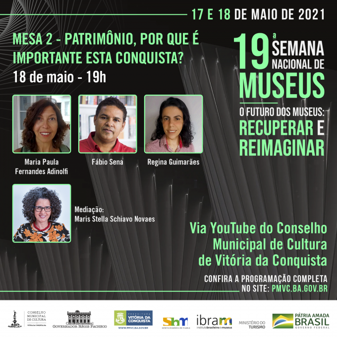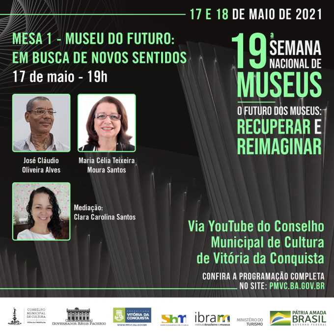 Neste ano, a Semana de Museus tem como tema “O futuro dos museus: recuperar e reimaginar” e, devido à pandemia do novo coronavírus, será realizada de forma virtual. “Conquista mais uma vez tem a honra e o prazer de estar participando e contribuindo para esse enriquecimento cultural que é a Semana dos Museus. Nesse novo formato virtual, nós teremos a participação importante do nosso Conselho Municipal de Cultura e convidados especiais que vão estar somando e nos ajudando a construir uma melhor política pública cultural nesse momento que estamos vivendo”, destacou o secretário de cultura, Adriano Gama.