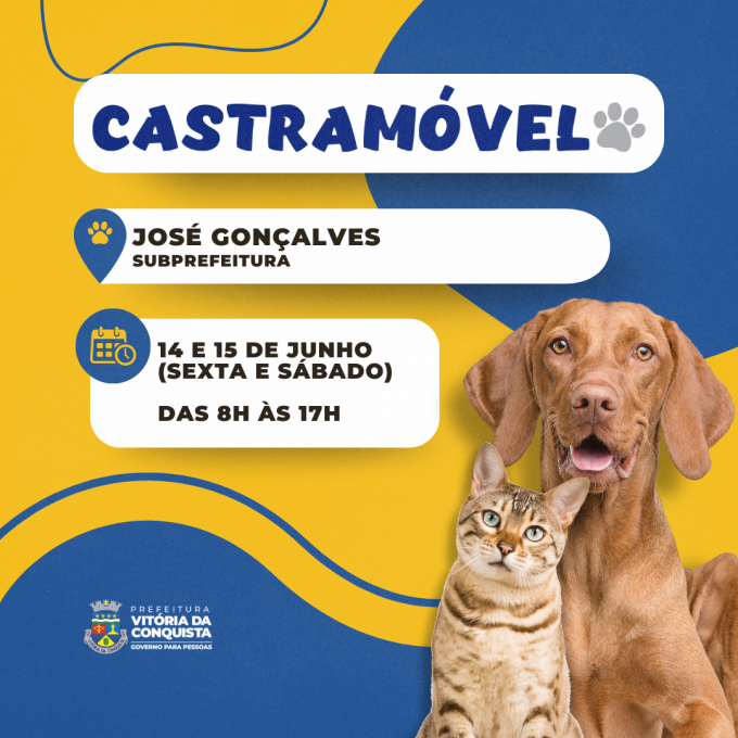 Nesta sexta-feira (14) e no sábado (15), o Castramóvel estará no distrito de José Gonçalves, a partir das 8h, na praça, em frente ao Posto de Atendimento Avançado ao Cidadão (PAAC/Subprefeitura), para atender animais de rua e de famílias de baixa renda.