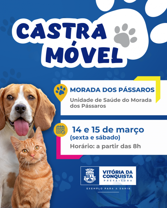Nesta sexta-feira (14) e sábado (15), o serviço itinerante do Centro de Apoio à Saúde Animal (Casa), o Castramóvel, estará no loteamento Morada dos Pássaros, para realizar atendimentos em cães e gatos, na sede da Unidade de Saúde. O atendimento começa a partir das 8h e os tutores deverão levar cópia do RG e comprovante de residência.