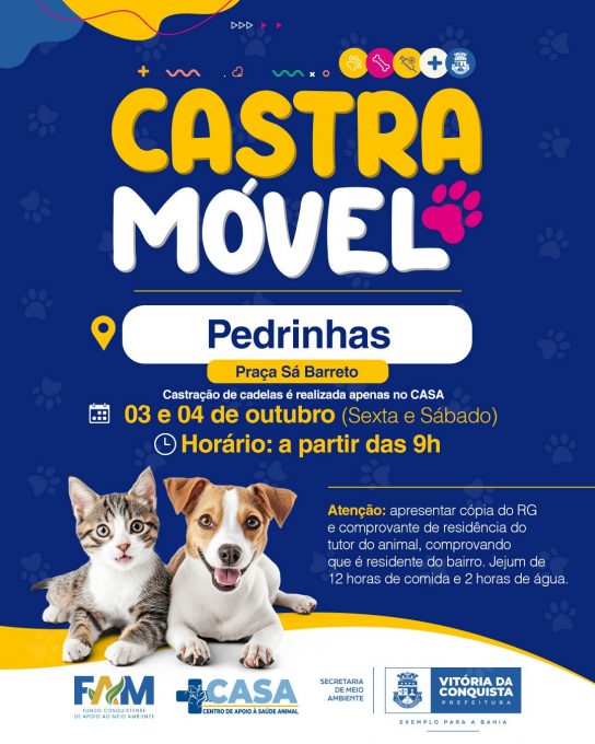 Nesta sexta-feira (3) e sábado (4), o Castramóvel estará na Praça Sá Barreto para o atendimento de cães e gatos dos moradores da Rua das Pedrinhas e imediações, a partir das 9h. Os tutores devem levar originais e xerox do documento de identificação (RG) e comprovante de residência. Os animais precisam estar em jejum de 12 horas de comida e duas horas de água.