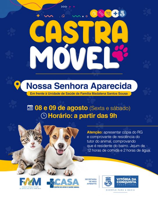 O Castramóvel chegará ao bairro Nossa Senhora Aparecida nesta sexta-feira (8) e sábado (9) para atendimentos em cães e gatos. O atendimento começa às 9h, em frente à Unidade de Saúde da Família Madalena Santos Sousa, e os tutores dos animais deverão se dirigir até o local portando documento com foto e comprovante de residência (original e cópia).