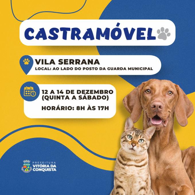 Desta quinta-feira (12) até sábado (14), o Castramóvel estará na Vila Serrana, bairro Zabelê, para realizar atendimento itinerante em cães e gatos. A unidade ficará ao lado do posto da Guarda Municipal, localizada na Avenida Rafael Spínola.