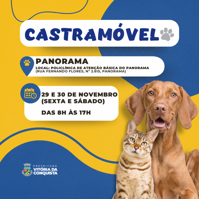 Nesta semana, o bairro Panorama receberá novamente o Castramóvel – unidade itinerante do Centro de Apoio à Saúde Animal (Casa), que oferece, gratuitamente, a cirurgia de castração de cães e gatos. Devido às chuvas, na semana passada, a maioria dos atendimentos não foram realizados. Por isso, o atendimento retornará nesta sexta-feira (29) e sábado (30), das 8h às 17h, em frente à unidade Policlínica de Atenção Básica do Panorama, localizada na Rua Fernando Flores, nº 2.615. Os tutores interessados no serviço deverão levar original e cópia do RG, além do comprovante de residência.